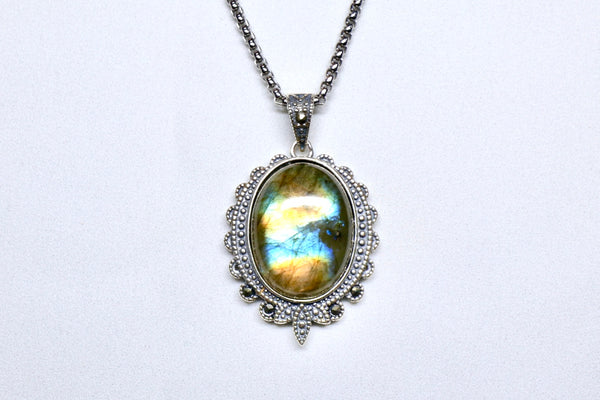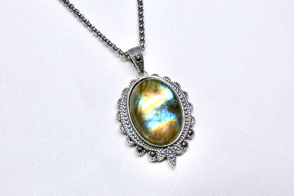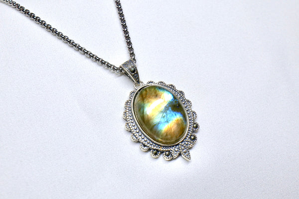 彩光拉長石銀太陽花頸鏈 |925純銀吊墜配鈦鋼粗鏈