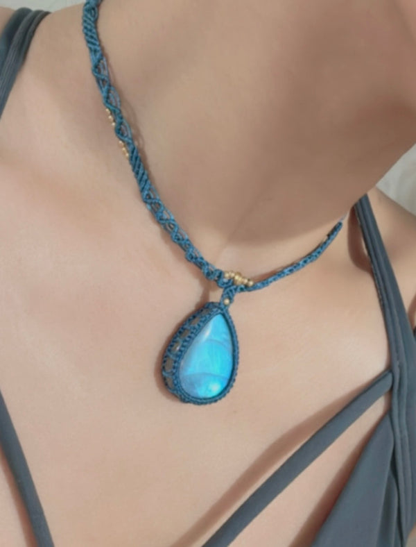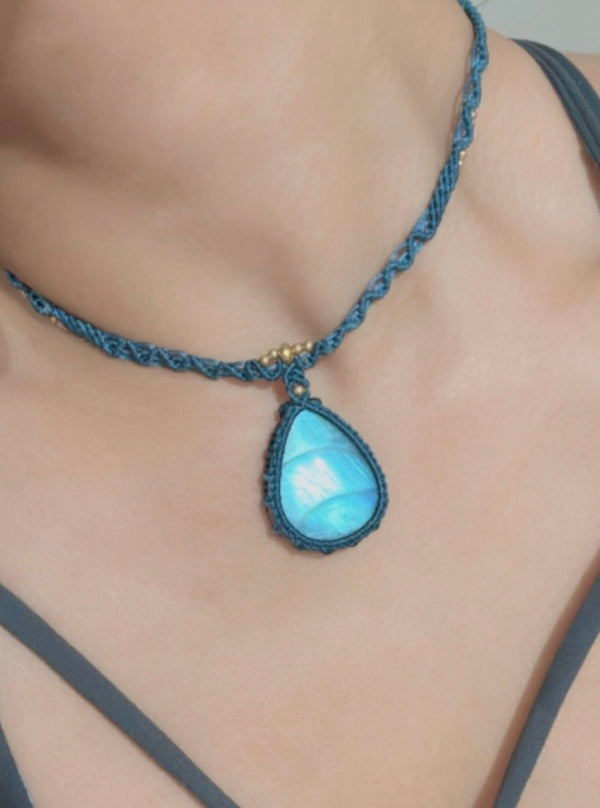 藍光水滴拉長石蠟線編織頸繩|粉藍色